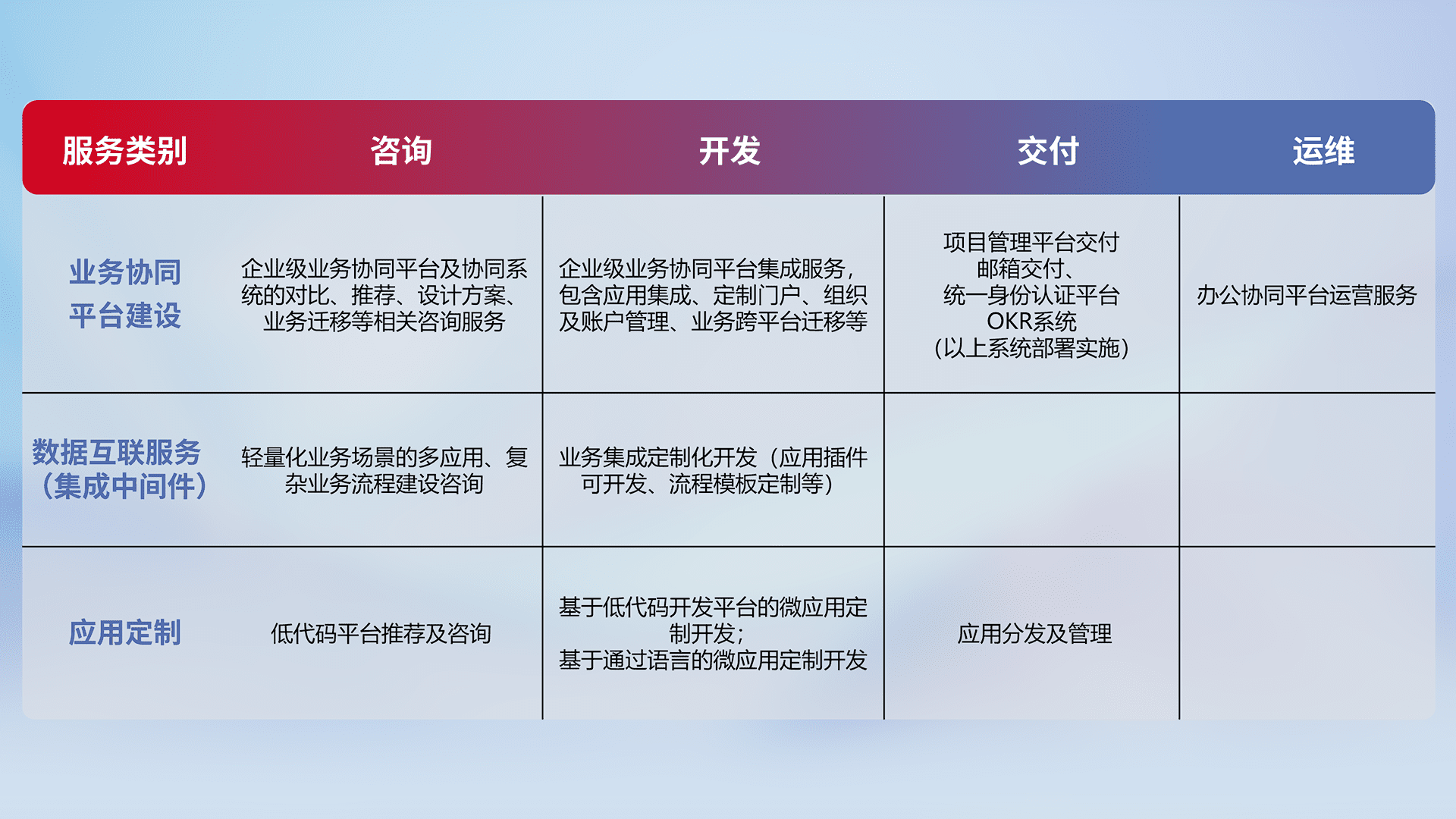 针对钉钉、、、企微、、、、IDaas等平台级产品提供产品的规划、、方案、、、、交付、、定制化开发等服务,,实现如统一协同办公、、、、智能客户服务、、、、混合会议管理、、、、智能数据查询、、、、等业务场景,,,,实现数字化转型。。。。