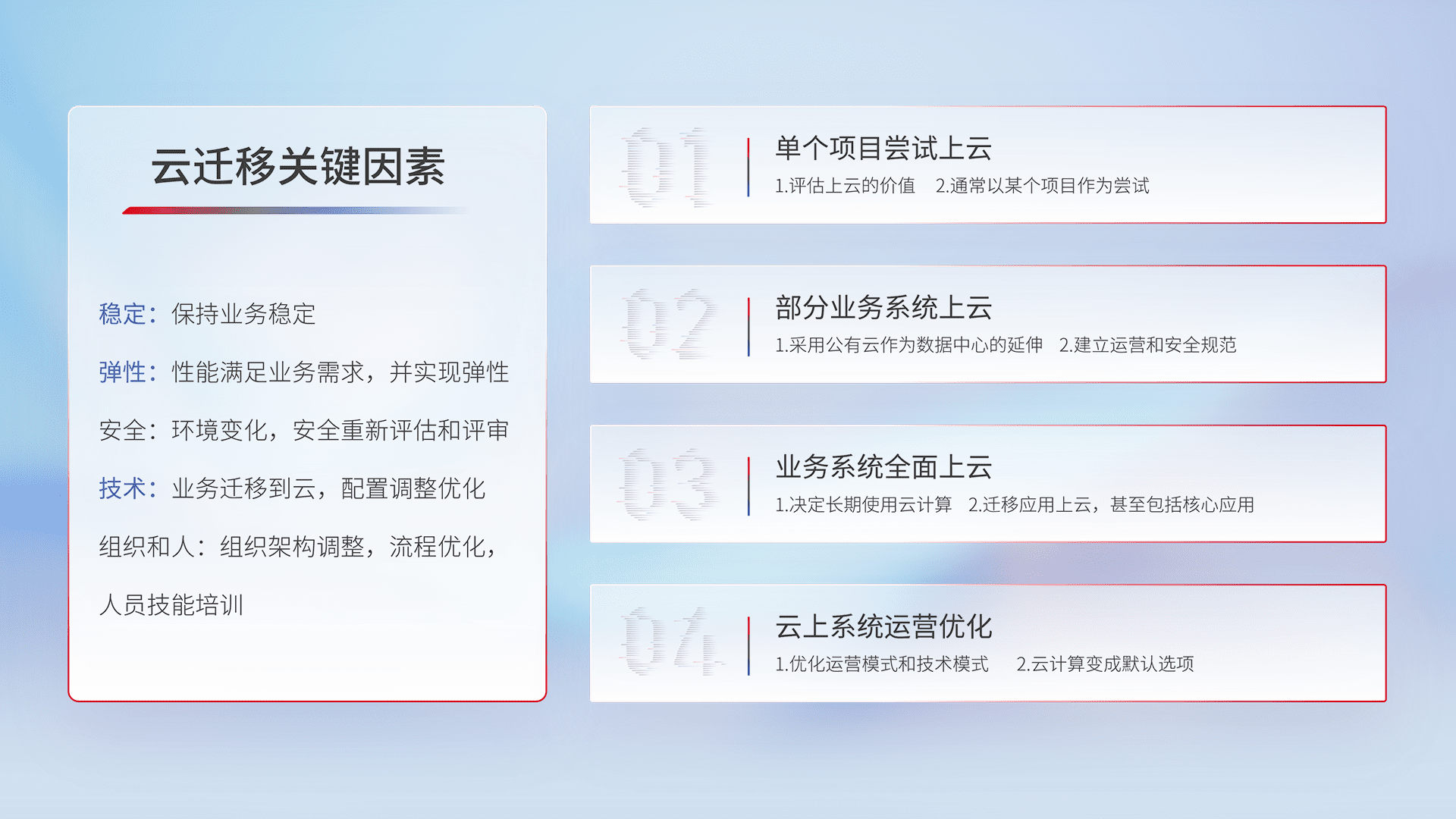 结合实际业务,,,从规划设计、、、、云平台选型、、、云原生改造、、、数据迁移、、、集成交付,,,,迁移全过程为客户识别最佳上云路径,,做好风险识别管理,,设计网络架构、、、身份权限、、、、安全审计合规、、操作审计、、、、日志审计、、、监控告警策略、、多站点容灾设计等,,,对云上基础设施进行整体规划,,提升IT治理水平,,,,以满足弹性、、、高可用、、高性能的需求。。。。