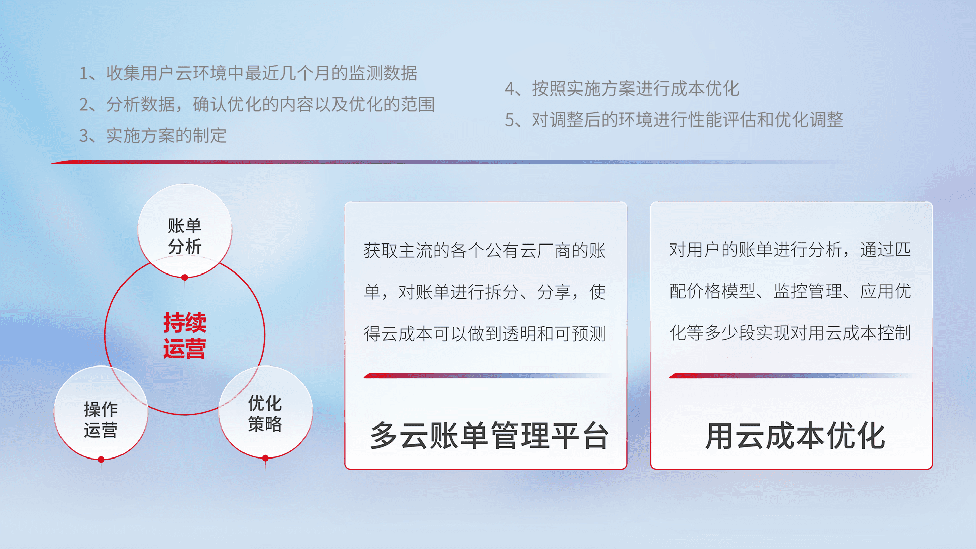 通过多云纳管,,,以统一的资源数据模型把客户的云资源进行抽象和封装,,进而实现对多云资源的统一操作,,,,保障云资源管理的可靠性、、稳定性与可用性。。量身定制化运维内容,,,配置、、、开发运维、、、补丁管理、、、备份、、、监控、、、、认证和访问管理、、、、审计和日常巡检等,,,,保障在用云过程中的可靠度,,,稳定度以及高可用率。。